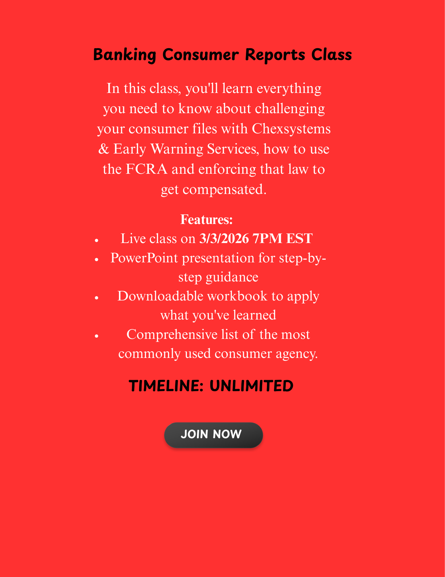In this class, you'll learn everything you need to know about challenging your consumer files with Chexsystems & Early Warning Services, how to use the FCRA and enforcing that law to get compensated.